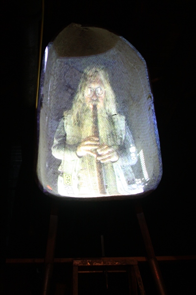 | One night only at "Pretty Vacant" pop up exhibition in Brooklyn. Spirit Tours projects honorary member and flutist Mickey Kramer's live performance image from the warehouse entrance into a suspended Wheelbarrow behind an official merchandise and 50¢ tarot stand. |