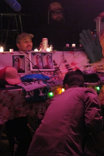| One night only at "Pretty Vacant" pop up exhibition in Brooklyn. Spirit Tours projects honorary member and flutist Mickey Kramer's live performance image from the warehouse entrance into a suspended Wheelbarrow behind an official merchandise and 50¢ tarot stand. |