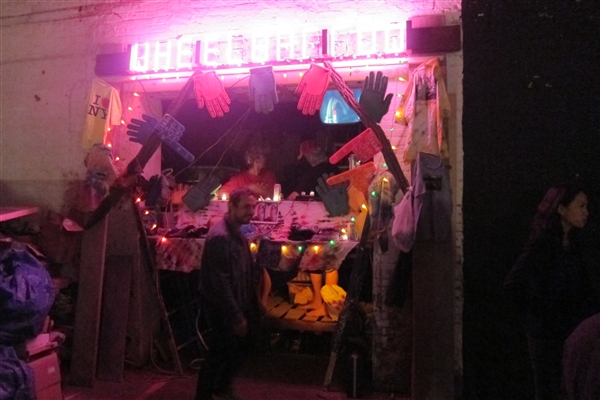 | One night only at "Pretty Vacant" pop up exhibition in Brooklyn. Spirit Tours projects honorary member and flutist Mickey Kramer's live performance image from the warehouse entrance into a suspended Wheelbarrow behind an official merchandise and 50¢ tarot stand. |