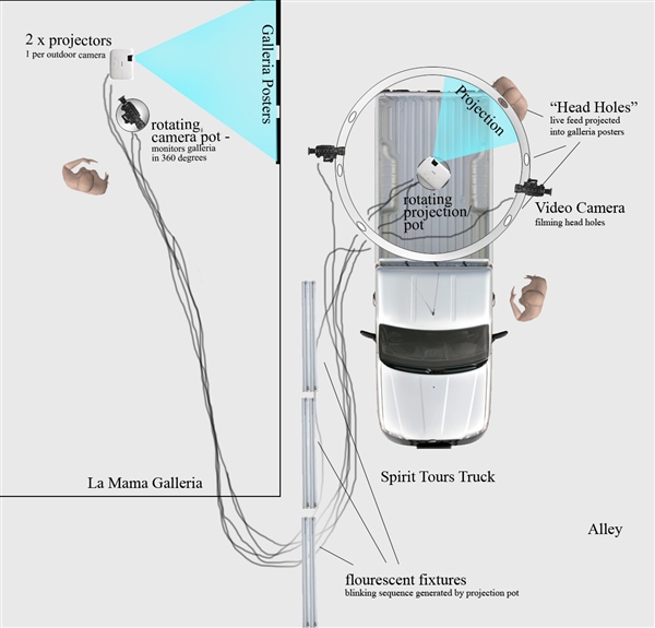 Part of Visual Aids "To Believe" exhibit at La Mama Galleria, NYC. Visitors peering into a cyclorama mounted on the Spirit Tours Truck parked outside of the gallery are witness to a 360º live feed of the gallery space. Conversely their faces are simultaneously telecast into a set of posters within the exhibition area.