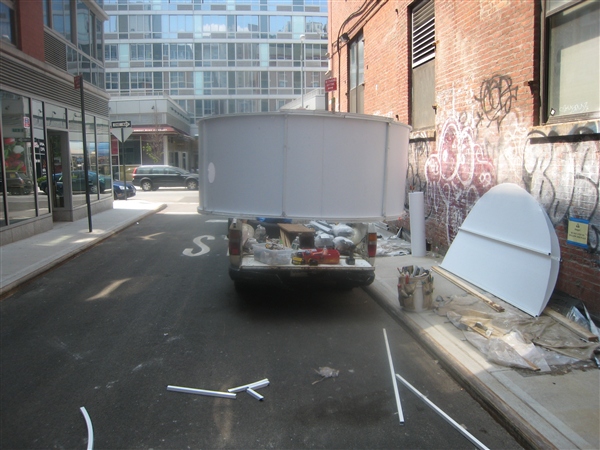 Part of Visual Aids "To Believe" exhibit at La Mama Galleria, NYC. Visitors peering into a cyclorama mounted on the Spirit Tours Truck parked outside of the gallery are witness to a 360º live feed of the gallery space. Conversely their faces are simultaneously telecast into a set of posters within the exhibition area.